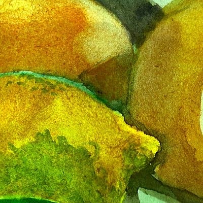 Traditionally painted still life of fruit, one lemon and two apples, delicately rendered in Water colour.